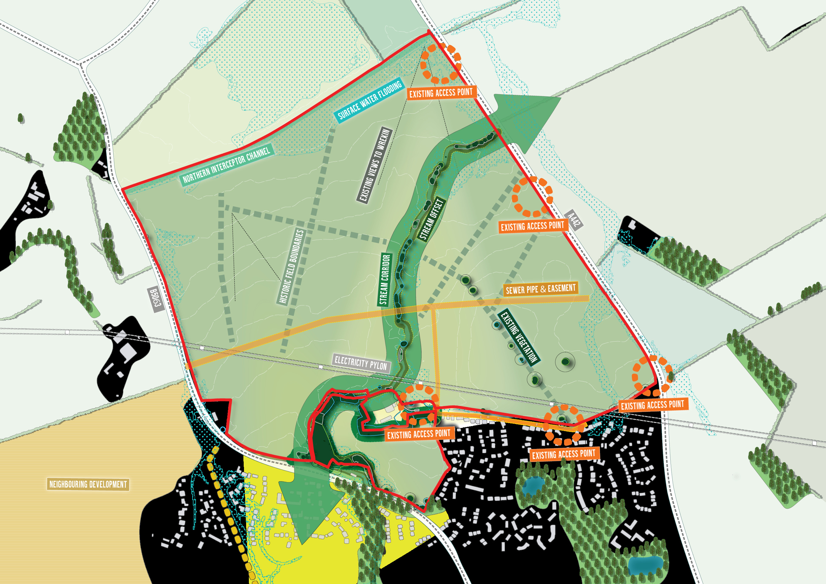 There are no Public Rights of Way (PRoW) crossing the site. A number of PRoW are located within the vicinity of the site to the west leading towards the villages of Longdon-on-Tern and down to Allscott. Providing an extensive network of new public walking and cycling routes within the site on land that has historically been inaccessible to the public forms a key element of the proposals for a healthy, sustainable, connected community.
